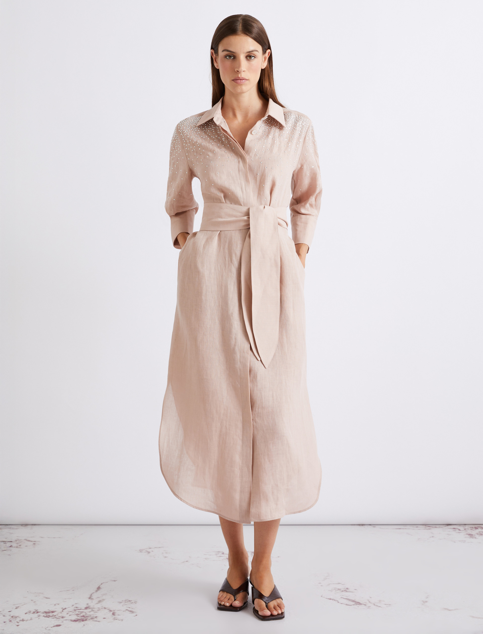 - Rhinestone-adorned pure linen canvas shirt dress
