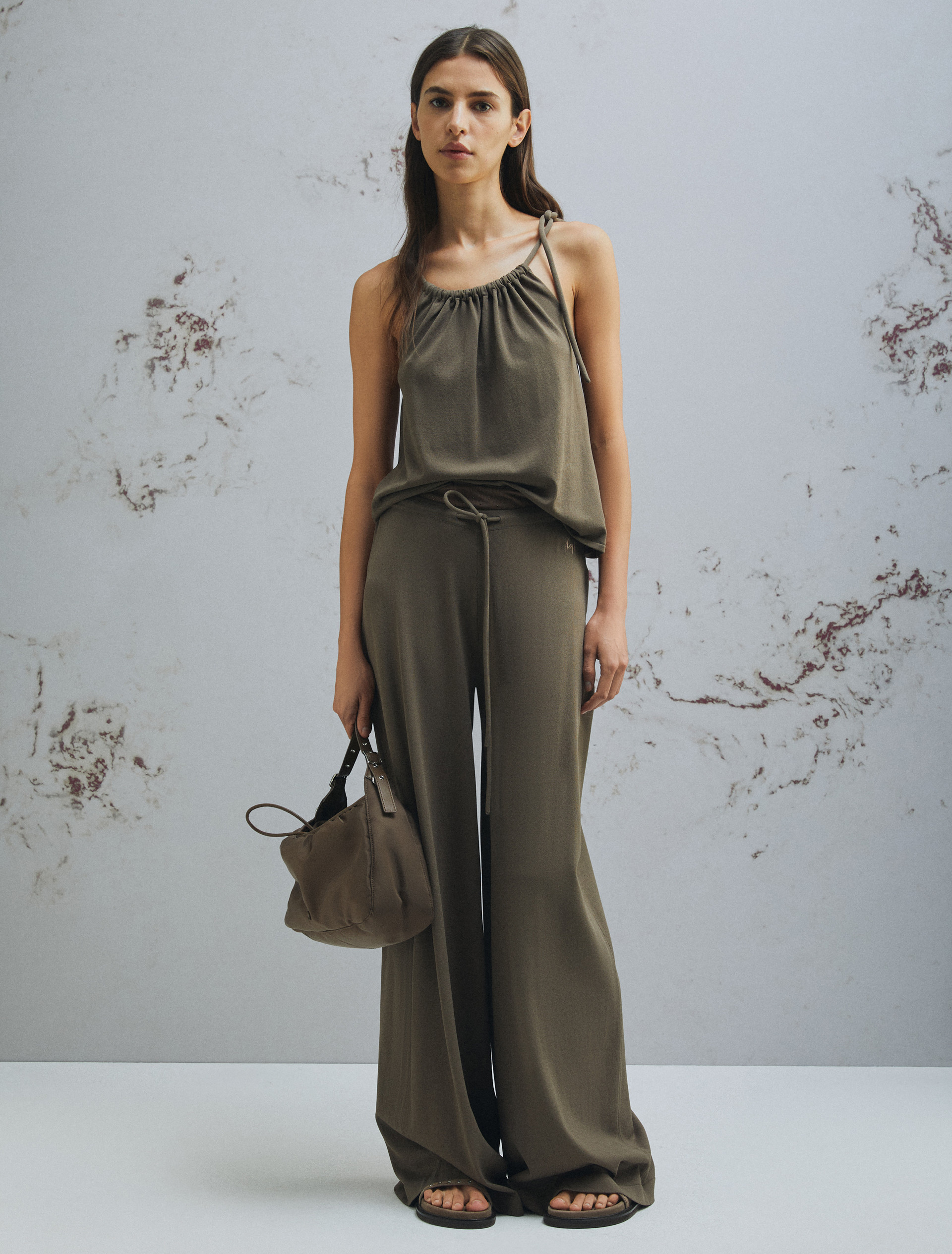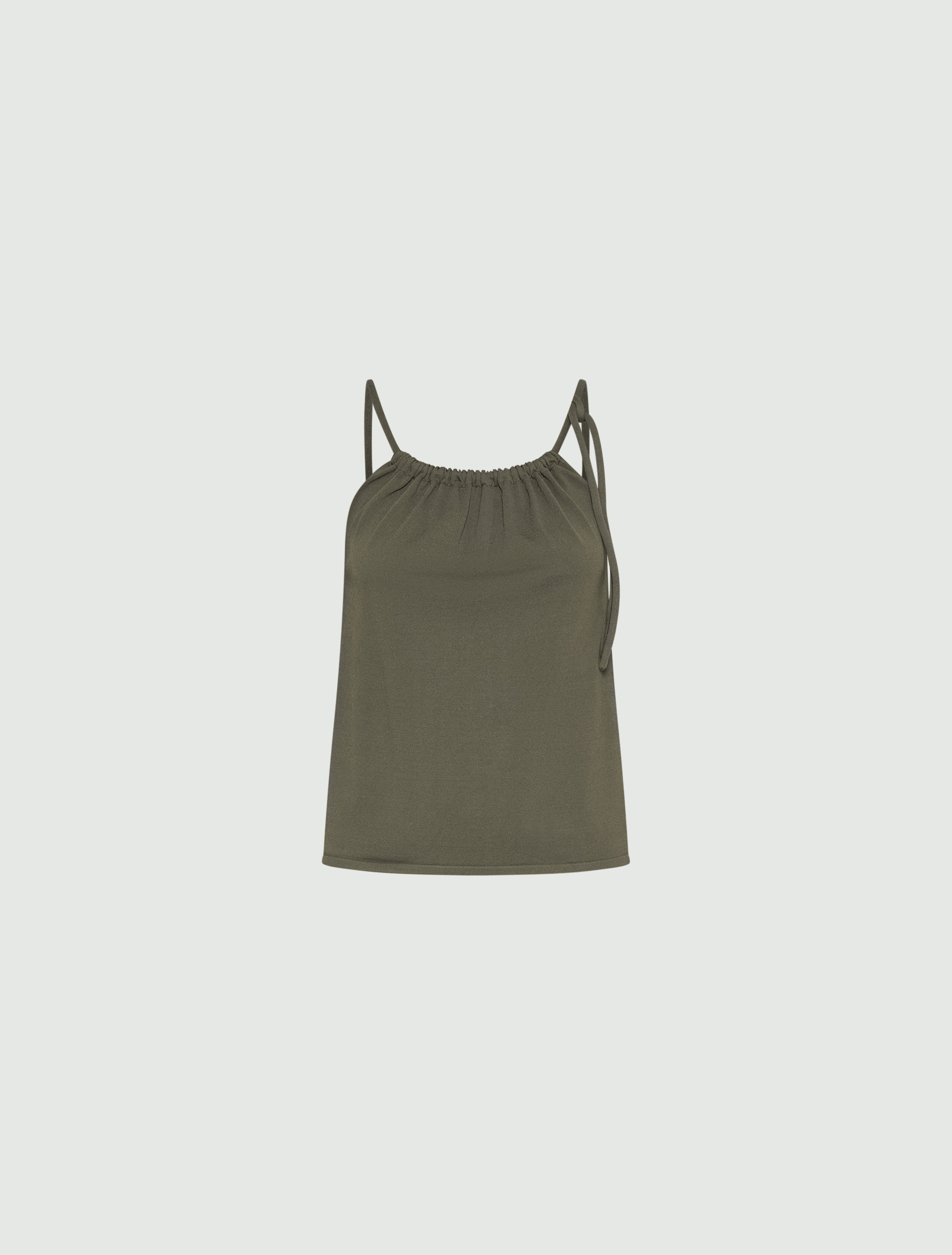 - Gathered round neckline with a slot-through tubular fabric shoulder strap